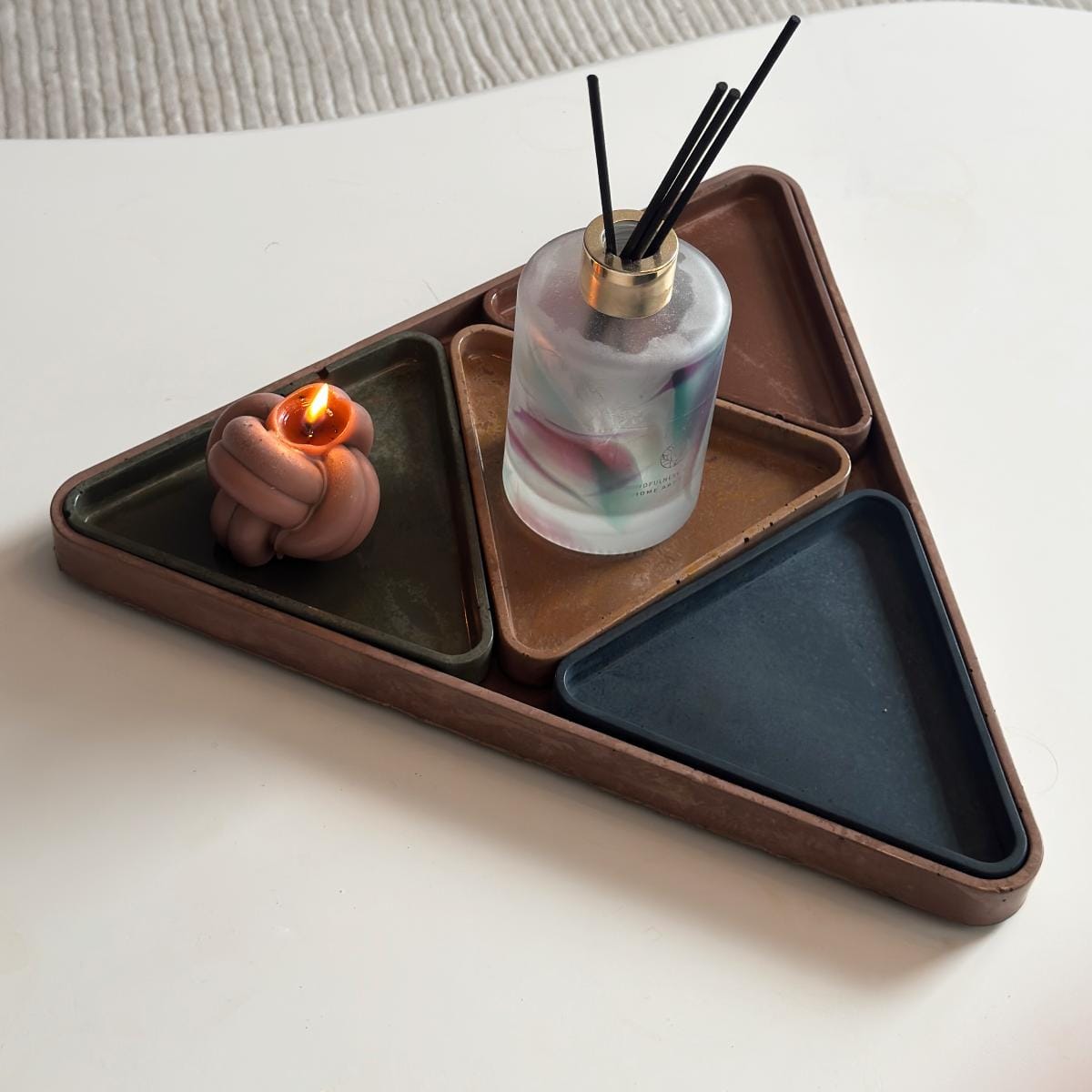 Du kannst das Set flexibel nutzen. Entweder als komplettes Arrangement auf dem Wohnzimmertisch oder Sideboard, oder du verwendest die kleinen Tabletts einzeln an verschiedenen Orten. So entsteht eine einheitliche Optik in der Deko, ohne dass alles gleich aussieht. Durch die dreieckige Form entsteht ein spannender, geometrischer Look, der besonders gut zu modernen Wohnstilen passt.